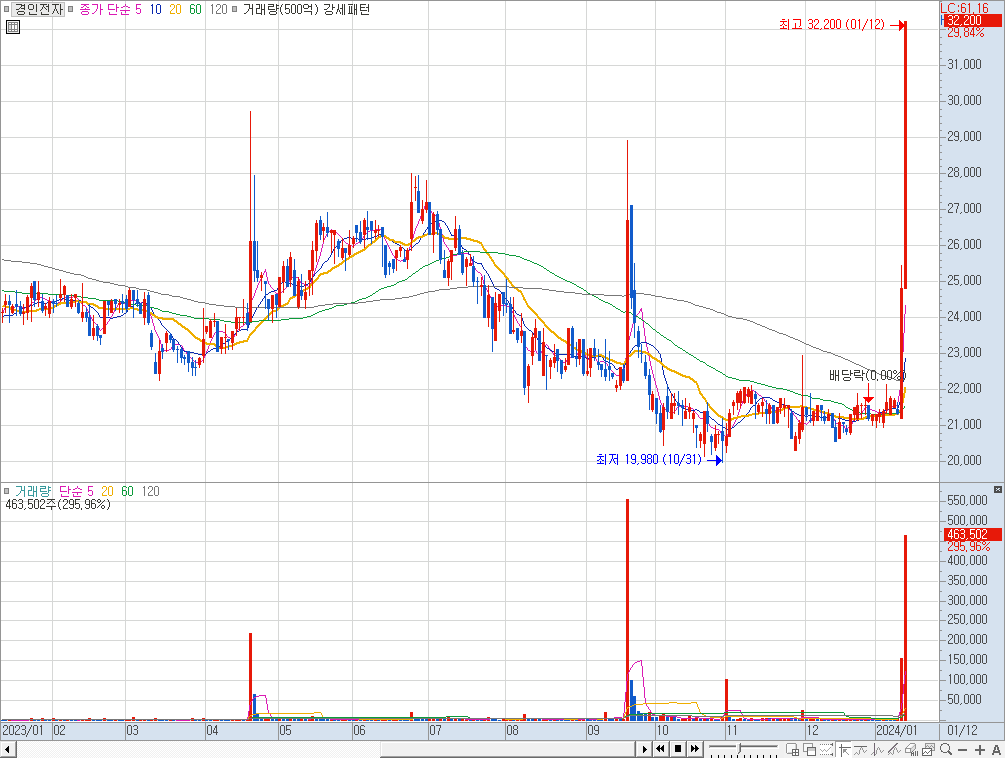경인전자(009140)의 주가가 강세다. 세계 최대의 전자 전시회 ‘CES 2024’에서 LG전자가 인수·합병(M&A) 계획을 발표한 영향으로 보인다. 12일 9시 30분 기준 경인전자는 전 거래일 대비 29.84% 오른 3만2