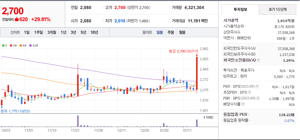 | 2024년 01월 11일 - 상한가 종목 (1) | 2024.01.11 |